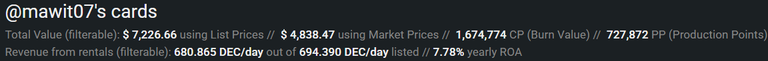 Through peakmonster's calculations I am currently earning close to 8% APR in DEC. This will not be sustained as I shift cards into land plots but in turn my land resource production shall increase. This is all a balancing act but earning any where close to 8% would be ideal.