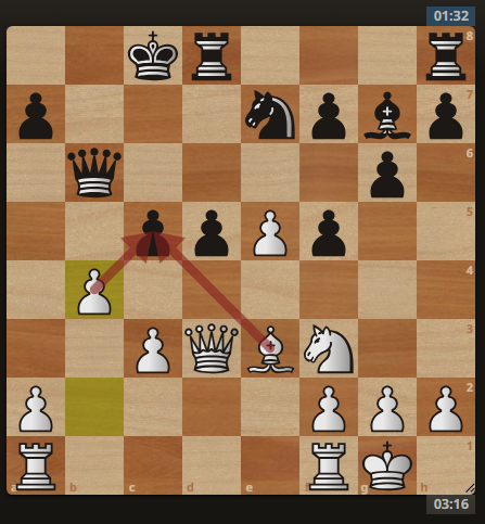 He declined and proceeded with c5. I answered with b4 to open some lines.