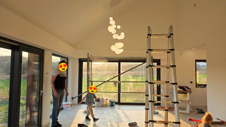 Well, honestly, it was a lovely day. I don't know if I made the best financial decision, but I decided to choose my overtime, so yesterday, for example, I popped into Gliwice for a doctor's appointment. Then some cleaning, a visit to the playground, a visit to the construction site, and then new lamps. The photo mainly shows the one that was already hanging, but a trained eye can spot one of the kitchen light points on the right. I like it 🙃