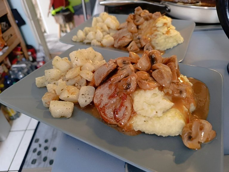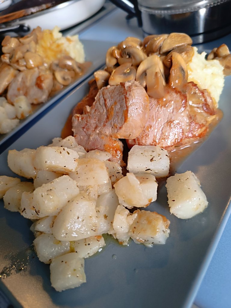 Pork tenderloin in mushroom cream sauce, turnips and mashed potatoes.