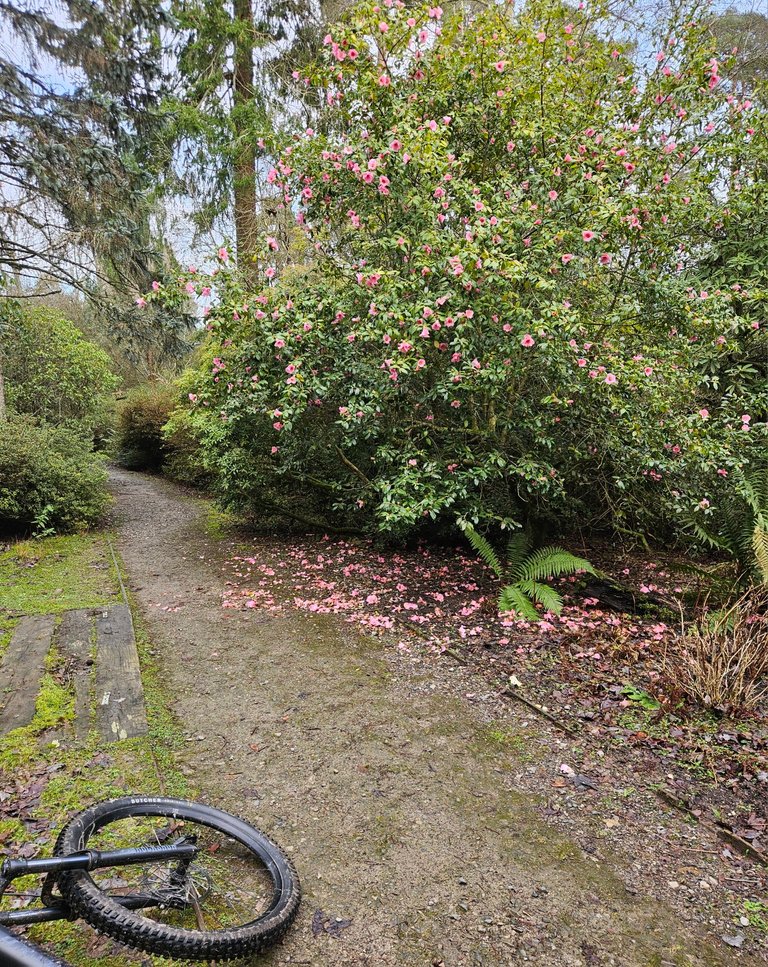 Yay for sunshine but sorry for the mud. Glad you were ready for it. Wow the camelia bush looks fantastic. So refreshing to see all the pink blooms. Thank you for sharing another lovely biking adventure day. Happy week ahead!