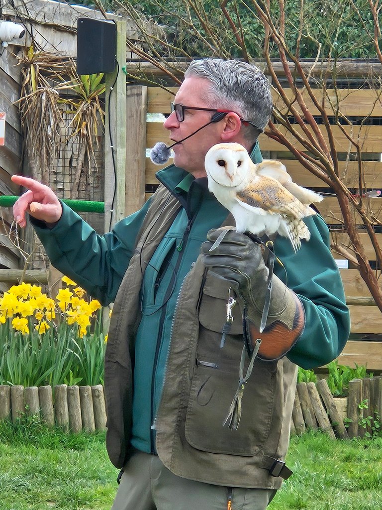 The barn owl was much more domesticated and was free to fly to the perches at will for feeding. Very entertaining too.
