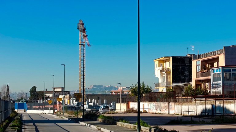 Dietro al cantiere, immersa nello smog della città, si erge il colle di San Martino con la famosa certosa incantevole monumento simbolo della città che sovrasta il capoluogo partenopeo.
