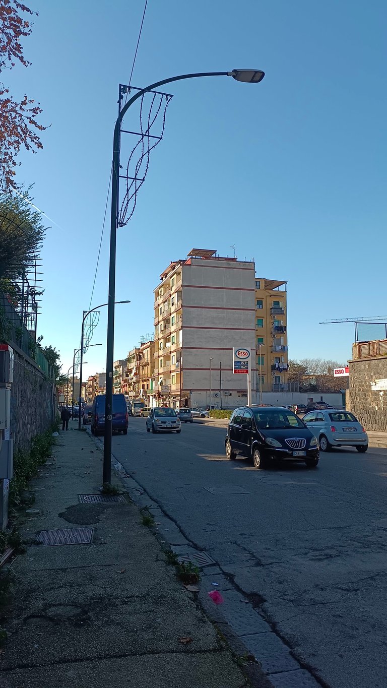 Behind the construction site, immersed in the city's smog, stands the hill of San Martino with the famous enchanting charterhouse, the city's symbol, overlooking the Neapolitan capital.