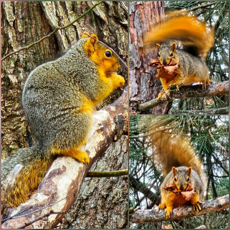 On our way to the forest, we met several squirrels again. Look at that aggressive one, waving its tails so quick it was blurry. The second one was busy eating.