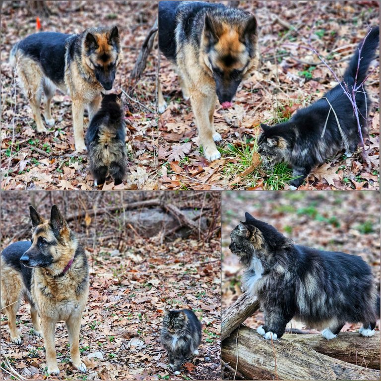 It's funny how, while exploring, Kaia and Le Chat often reacts to the same noises. In this case, it was a squirrel nearby, and Le Chat said: 'I'll handle it...', which means she just acted tough and looked at it climb in a tree...