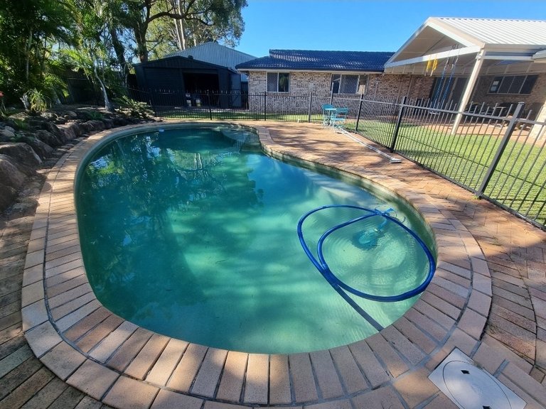 I usually just turn the pool off when we are away and throw in a floating chlorine tablet. It works quite well on the shorter trips, but this time, we were away for longer, and it got a bit out of control.