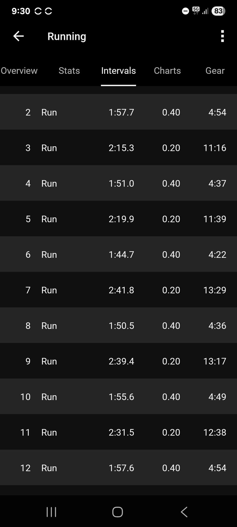 It wanted me to do 6 x 400m at or just under my goal pace of 4:45 per kilometre. I did better than I thought, but I needed the full 200m walk in between.