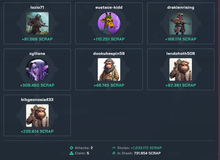 From my terracore base let me quickly just share the attacks done today and the number of scraps won with them in the screenshot below. There were seven attacks but we only won around 1033 scraps with them.